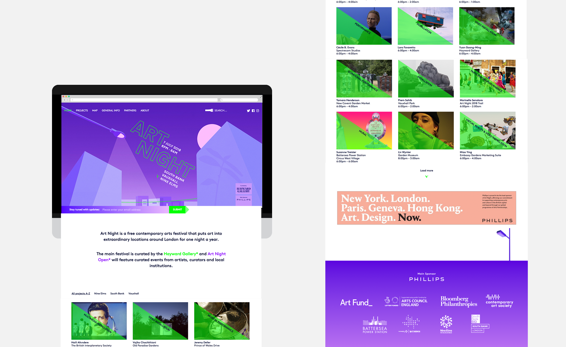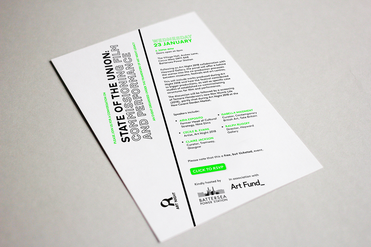 Art Night was London’s largest free contemporary art festival. In 2018, it was curated by the Hayward Gallery, with a trail that twisted from Battersea through Vauxhall, to the Southbank.