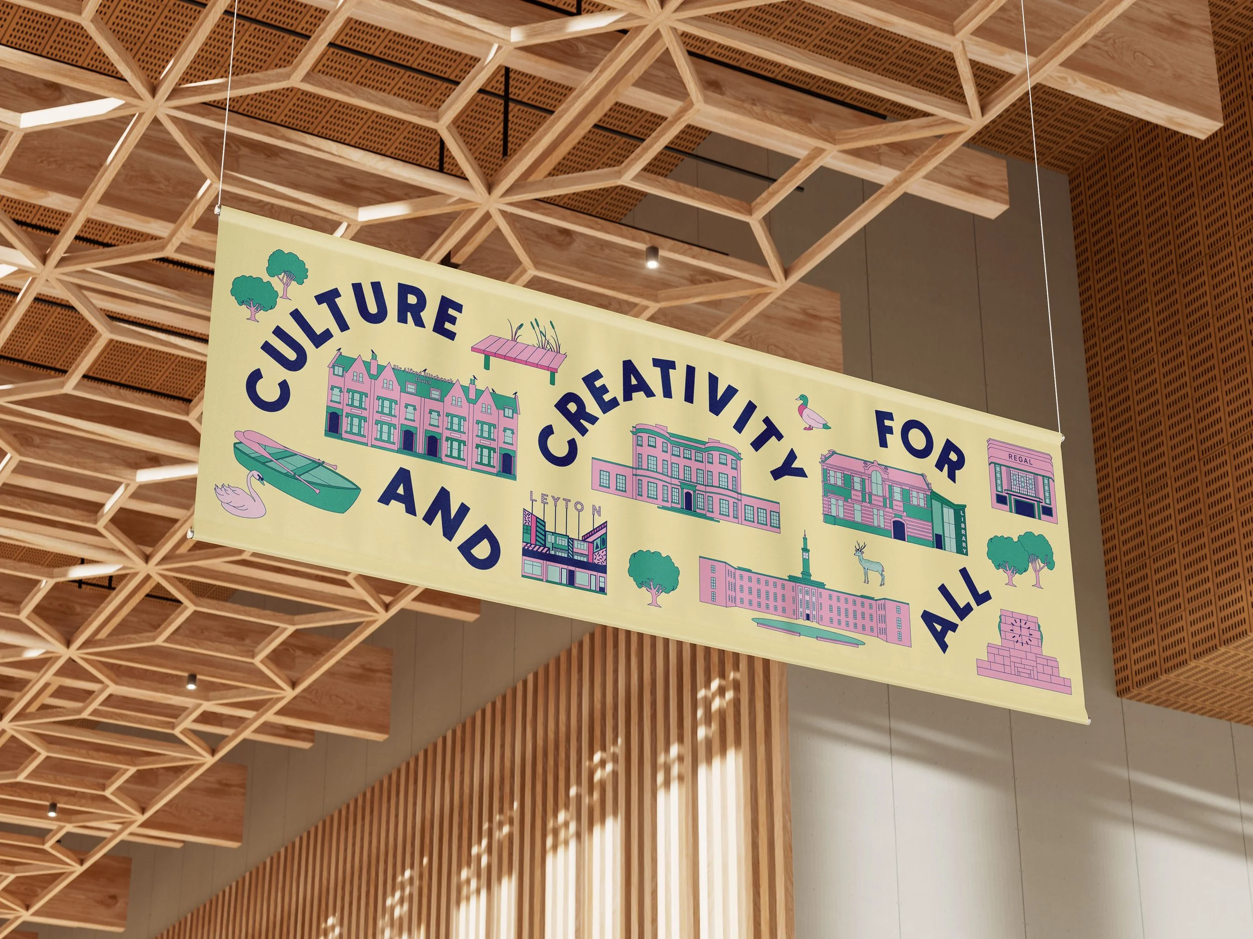 As part of their new cultural strategy plan, Waltham Forest Council asked for a series of simple and colour compliant illustrations that represented iconic landmarks across the borough — all to be laid out within the project’s tagline ‘Culture and Creativity for all’.
